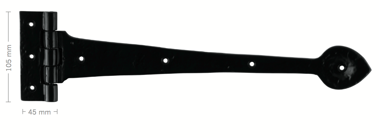 Heng met scharnier van zwart smeedijzer voor bijvoorbeeld het bevestigen van uw schuttingdeur. Deze heng met scharnier is in verschillende afmetingen verkrijgbaar.