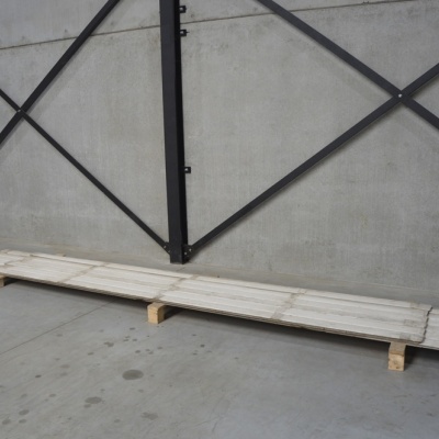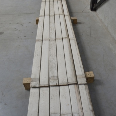 Lengtes van 4,3 tot 5,5 m. Deze zijn niet apart te bestellen, jouw bestelling kan dan ook diverse lengtes bevatten. De planken zijn geverfd. Op foto 2 is de achterkant van de planken te zien.