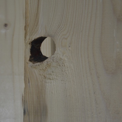 Noestjes ontbreken op sommige plekken, zichtbare verbindingen en oude schroefgaatjes zijn zichtbaar